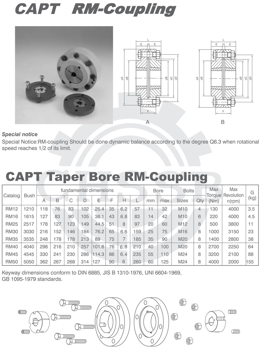 產品范圍: 美標/歐標:(RM) 英制尺寸產品(適用于美標市場) 公制尺寸產品(適用于歐標市場) RM型聯軸器